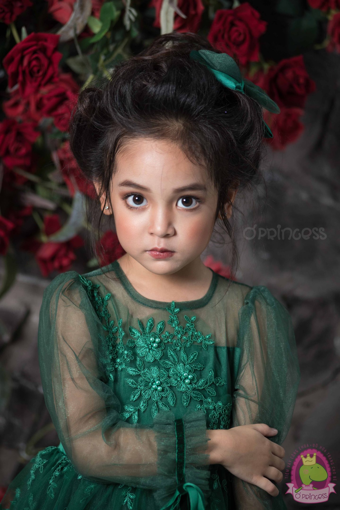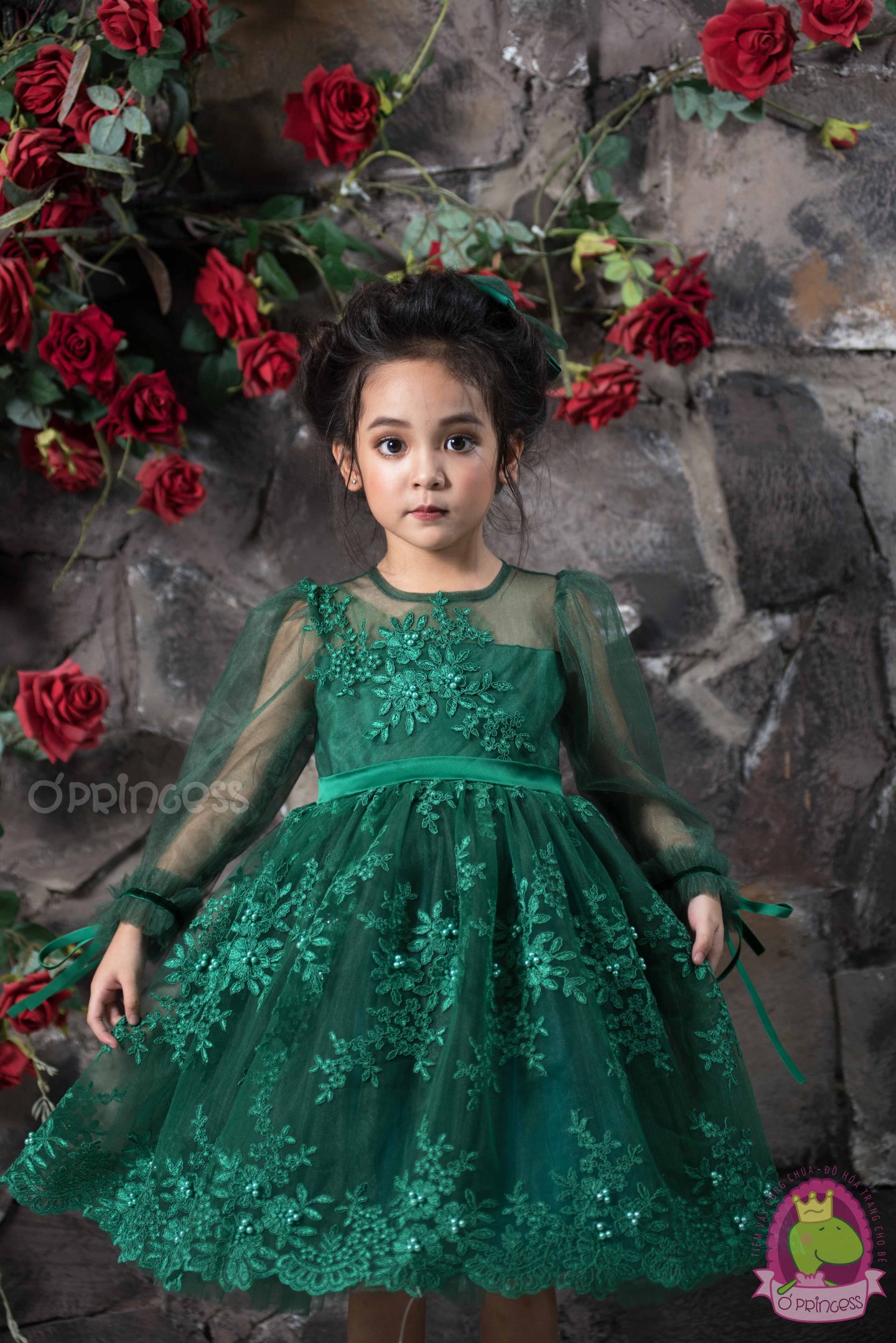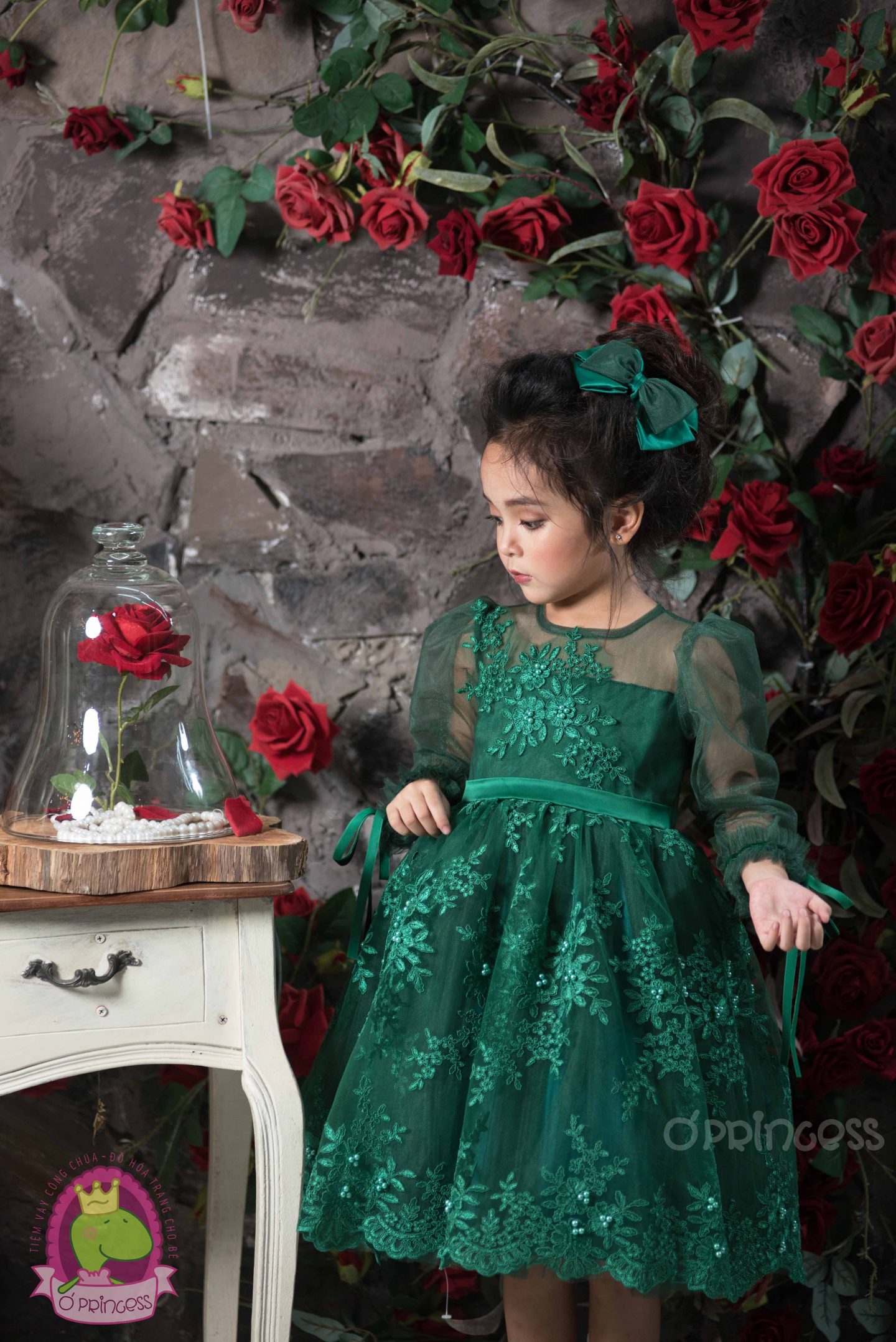 Váy công chúa thiết kế màu xanh lá phối may ren cùng màu ton sur ton