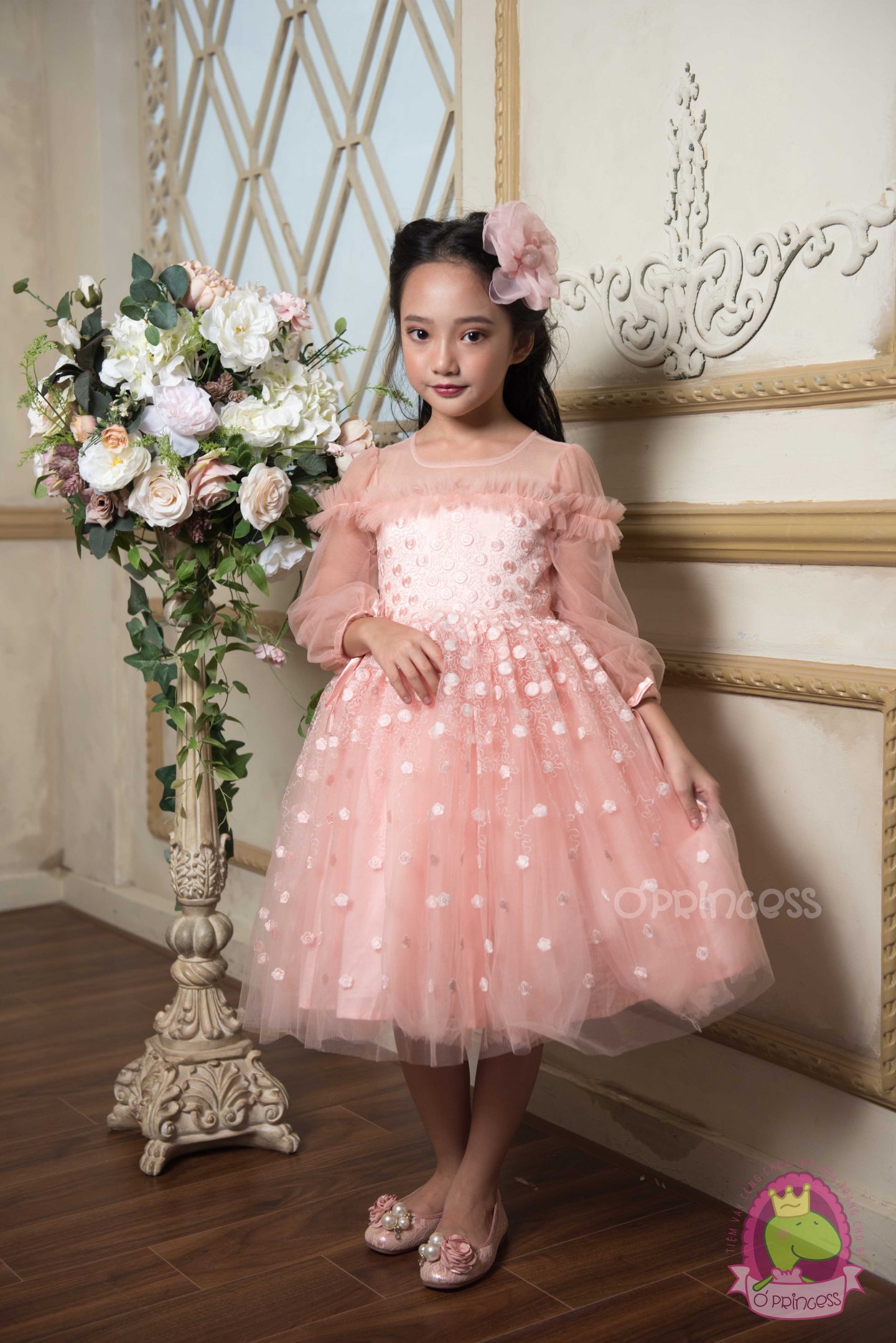 Váy công chúa thiết kế ren tinh tế, điểm nhấn voan nhúm béo ngang vai giúp chiếc váy công chúa thêm điệu đà và nổi bật hơn